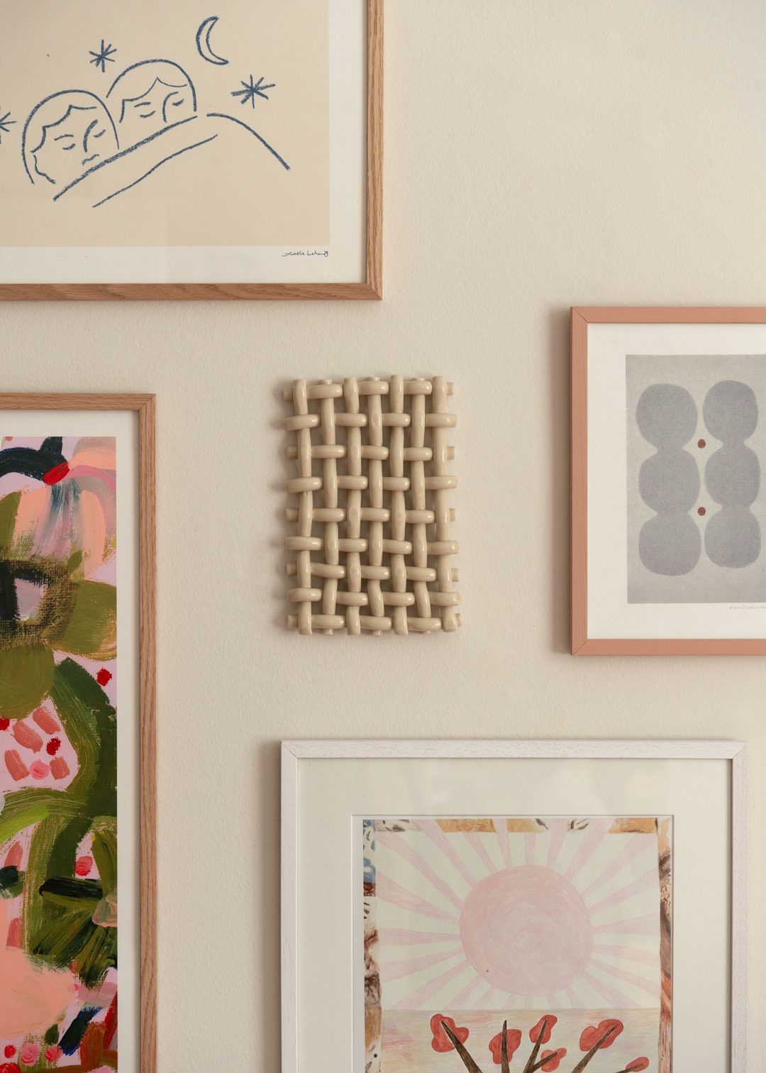 This art wall balances softness and contrast through a mix of delicate drawings, playful motifs and tactile elements. Muted tones of blush, cream and warm grey are punctuated by deep blue and crisp black, enhancing the understated and restful mood. A compact arrangement that feels intimate, thoughtful and quietly expressive.