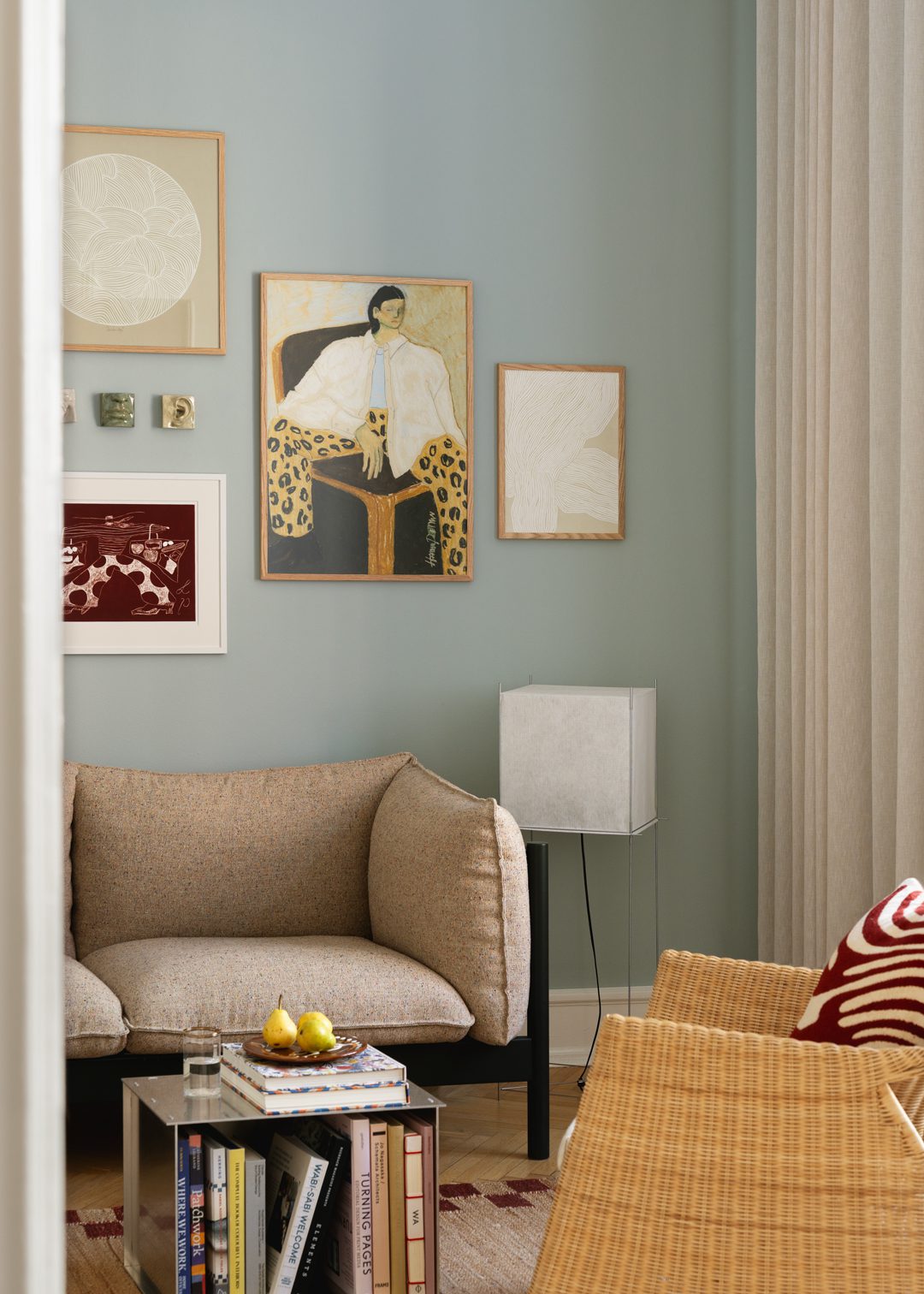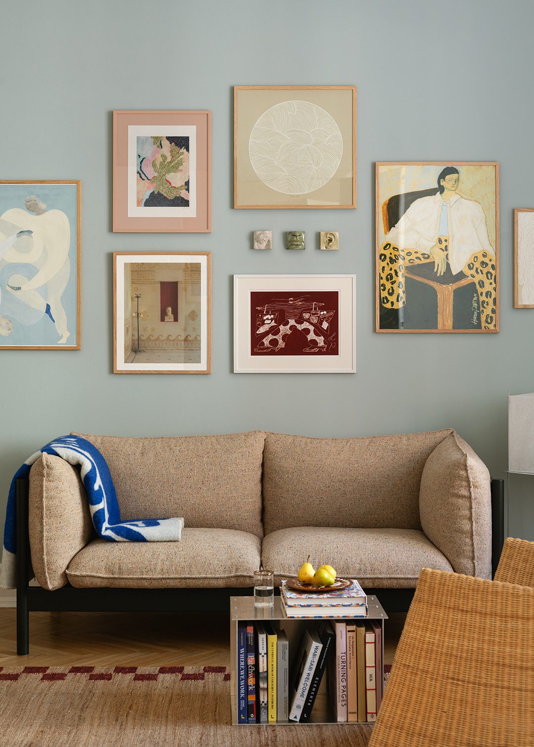 A decorative art wall in shades of light blue, soft pink, beige and bordeaux. Graphic works, figurative pieces and photographic details are arranged in a balanced composition, with passepartout and ceramic Wall Objects by Laoru Laoru adding depth and materiality. The mix of tones and textures brings a calm yet characterful presence to the room.