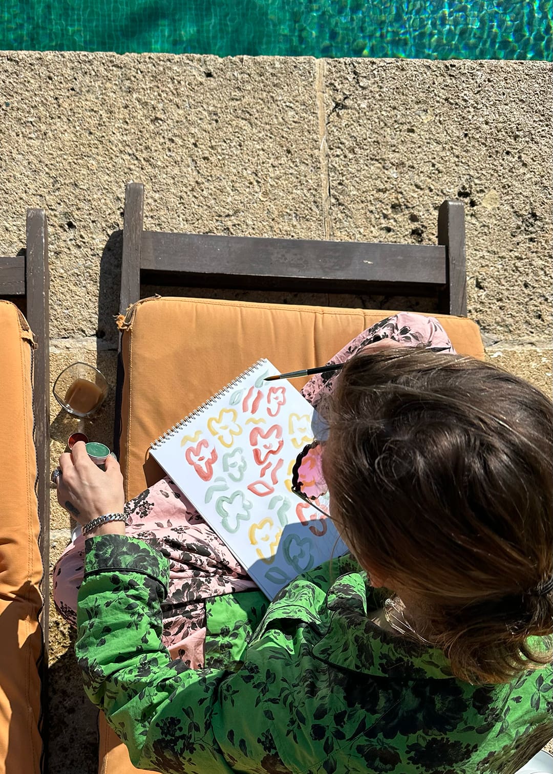 Colour sits at the centre of Karolina’s practice. Drawn instinctively and generously, it functions as both material and mood. “I love colour,” she says. “To see beautiful colour combinations can make me happy in a way few things can.” Her prints invite a sense of pause and escapism, shaped by travel, memory and the pleasure of working freely with colour and form.