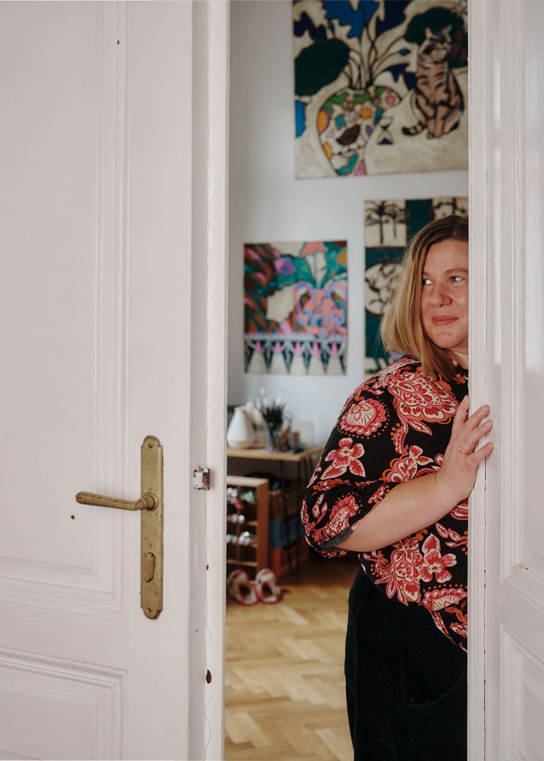 Leaves or parts of plants are often the trigger for a painting and are combined in details and shaped with acrylic paints to create beautiful still life works. For Rini, these simple and serene motifs often reveal more than meets the eye. And while nature is an eternal source of inspiration, her artistic influences span diverse movements and periods, including the Wiener Werkstätte, Art Nouveau, the expressive palette of Expressionism and the composition styles of Baroque. She finds equal fascination in craftsmanship, exploring textures and patterns of fabrics — and even the unfiltered creativity of children finds its way into her work
