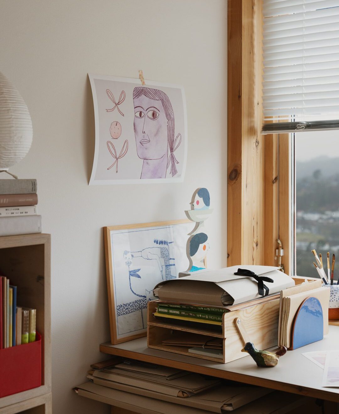 Pencils and watercolour on paper create a soft, textured foundation, later refined digitally but never losing the rawness of hand-drawn imperfection. Colours are muted yet deliberate, with blue and orange recurring alongside tones of plum and green.