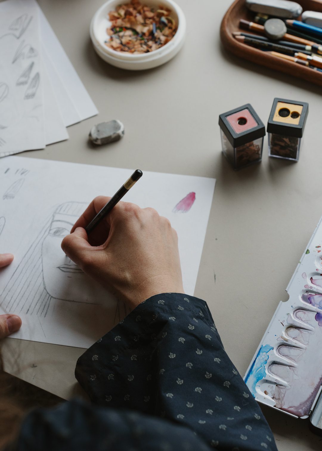 Each piece in the collection is drawn with a simplicity that belies its complexity. What appears effortless is the result of careful reworking, where erased layers remain faintly visible, giving depth to every line.