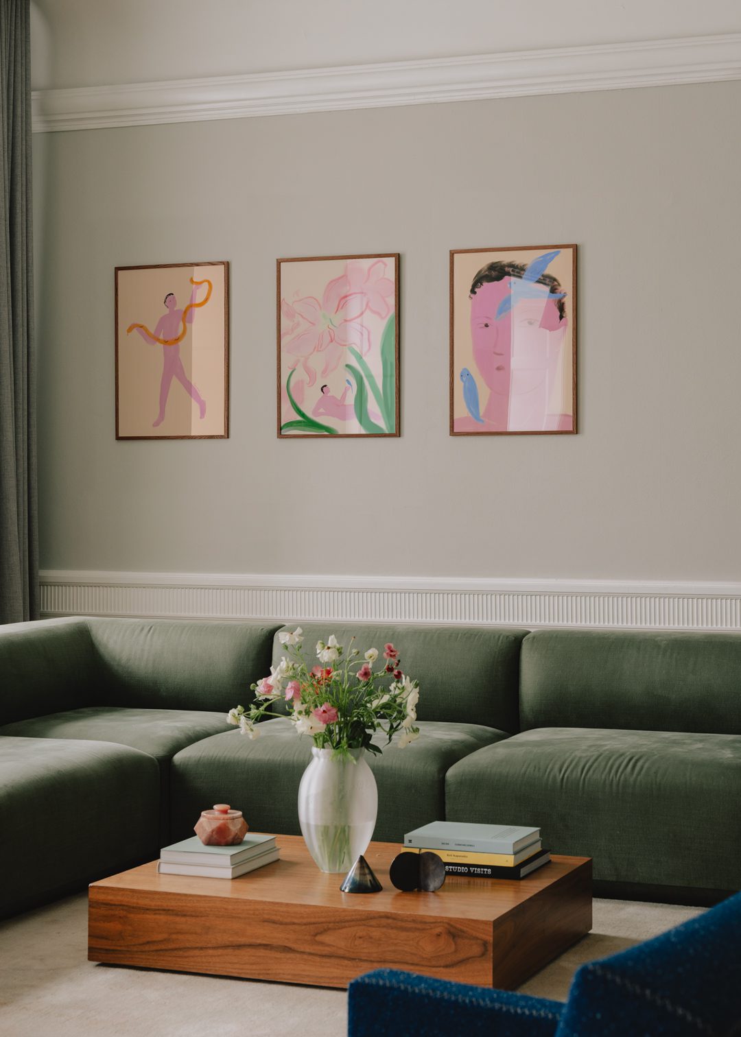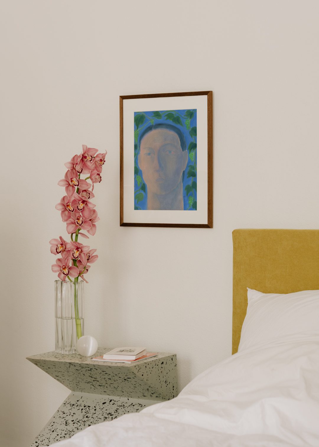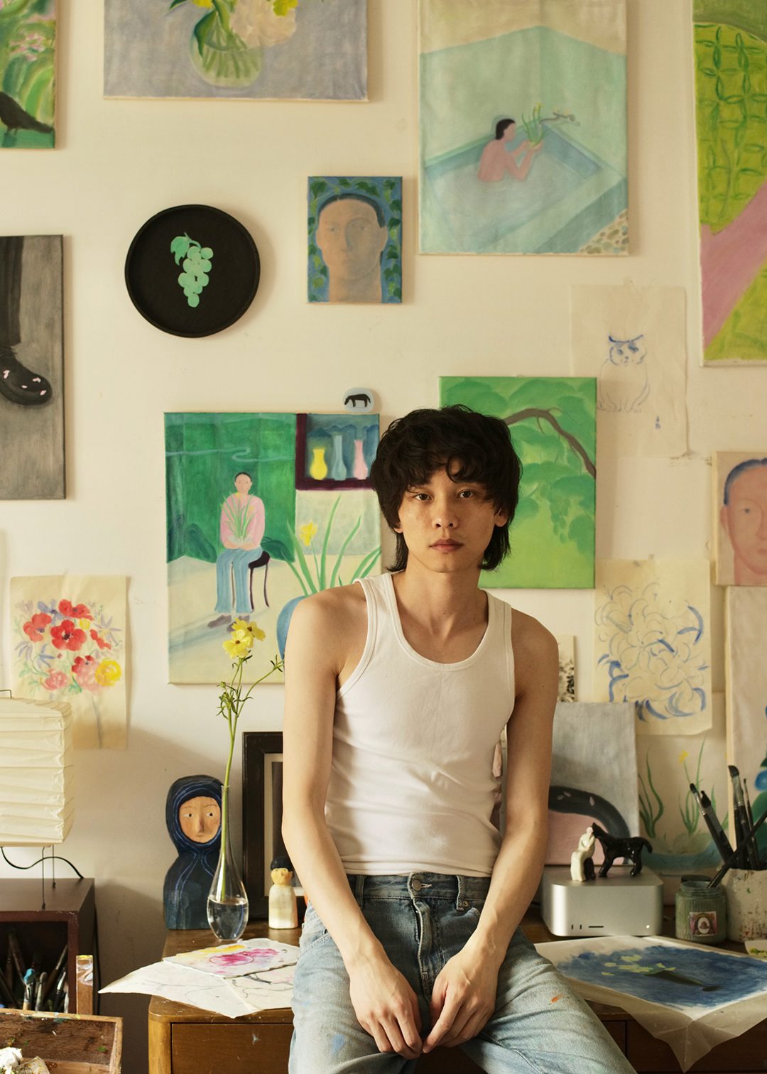 Through a layered mix of digital painting, ink and oil, Oamul achieves a sense of suspension – as though the images have been plucked from a dream just before waking. Some pieces feel translucent, fleeting. Others hum with saturated colour and quiet intensity. The palette is soft and measured, with tones of pink, pale green and milky yellow balanced by deeper blues.