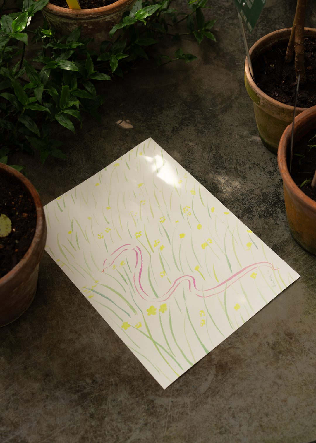 A figure walks with a snake, not in fear but in quiet communion. A hand holds a bird with delicate stillness. A body reclines beneath an oversized bloom, as though dissolving into the foliage around it. These scenes suggest not only coexistence, but a deeper kind of recognition – an awareness of self that exists without language, without performance.