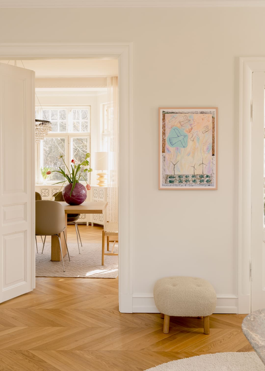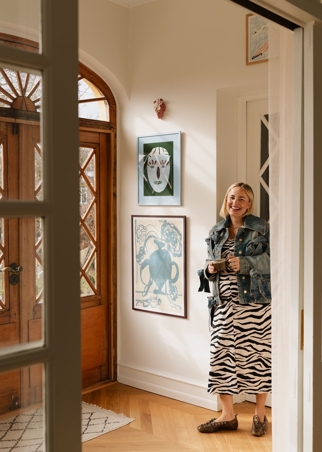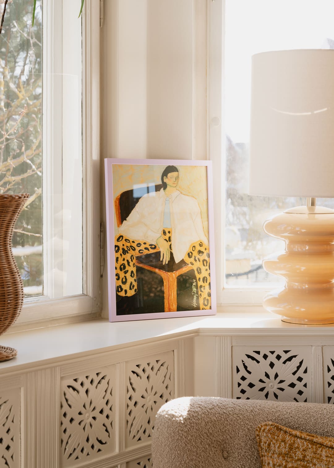 Her Curated by selection follows the same logic. She gravitates towards hand-drawn works that awaken memories and feelings of childhood – “in a way, it helps create the hygge,” she says. Colour is kept in dialogue rather than pushed into high contrast, aiming for calm and comfort across the rooms. Her favourite print is Fashion Diva 01 by Hanna Peterson – a piece that captures what she looks for when art becomes part of a home: something you can live with, return to and feel, every time you pass it.