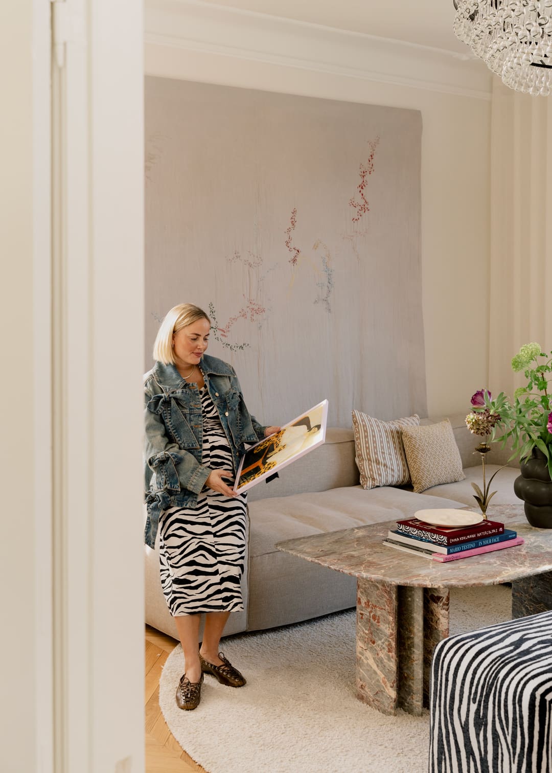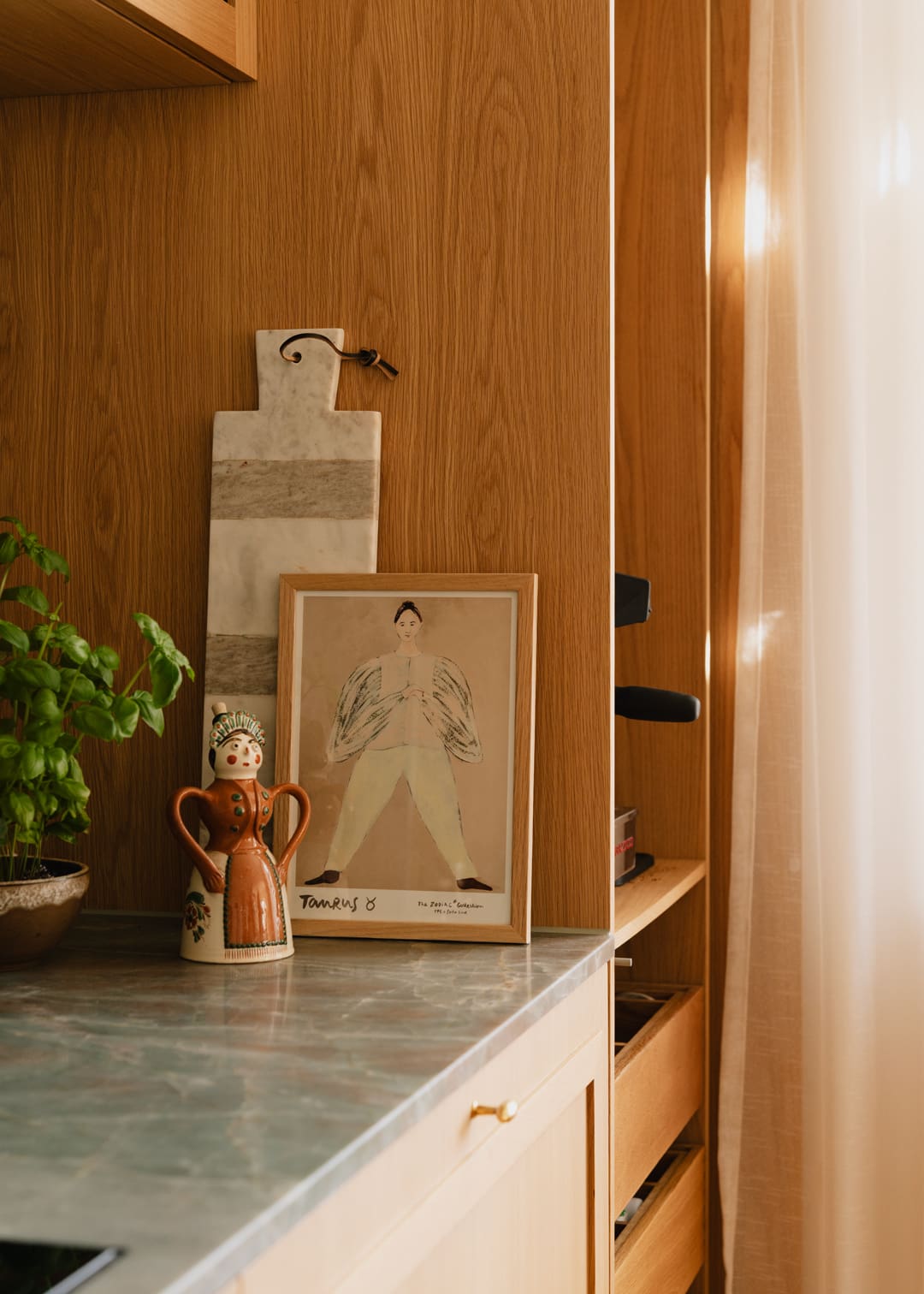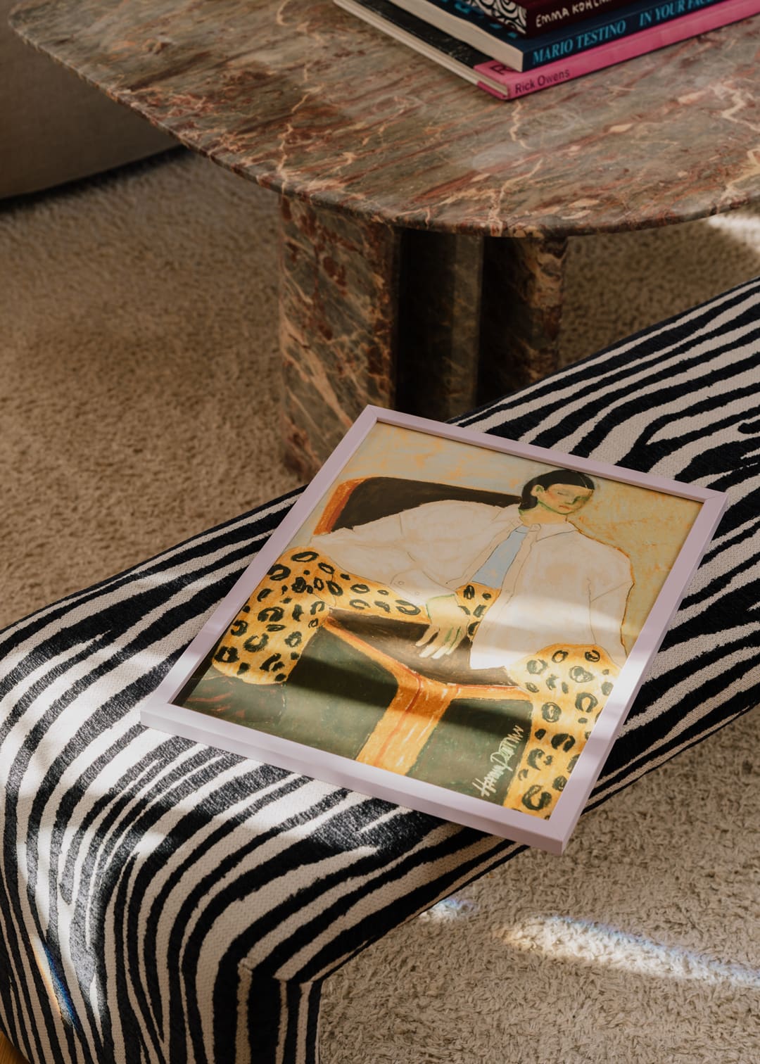 Her Curated by selection follows the same logic. She gravitates towards hand-drawn works that awaken memories and feelings of childhood – “in a way, it helps create the hygge,” she says. Colour is kept in dialogue rather than pushed into high contrast, aiming for calm and comfort across the rooms. Her favourite print is Fashion Diva 01 by Hanna Peterson – a piece that captures what she looks for when art becomes part of a home: something you can live with, return to and feel, every time you pass it.
