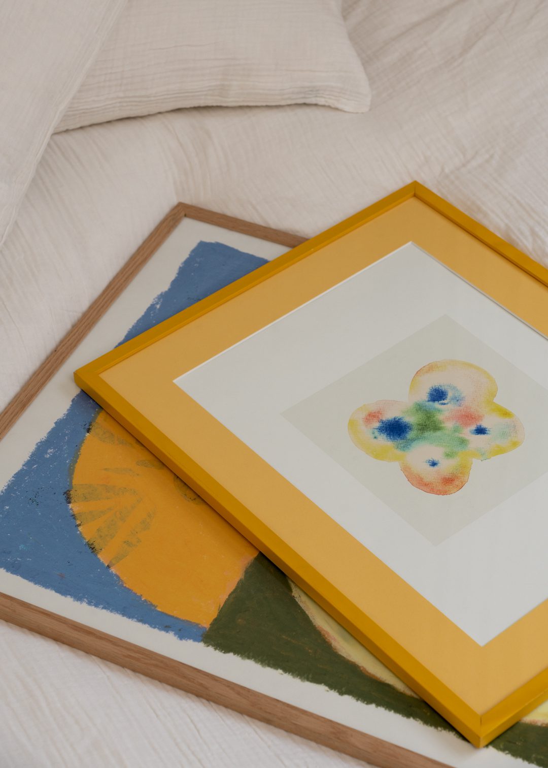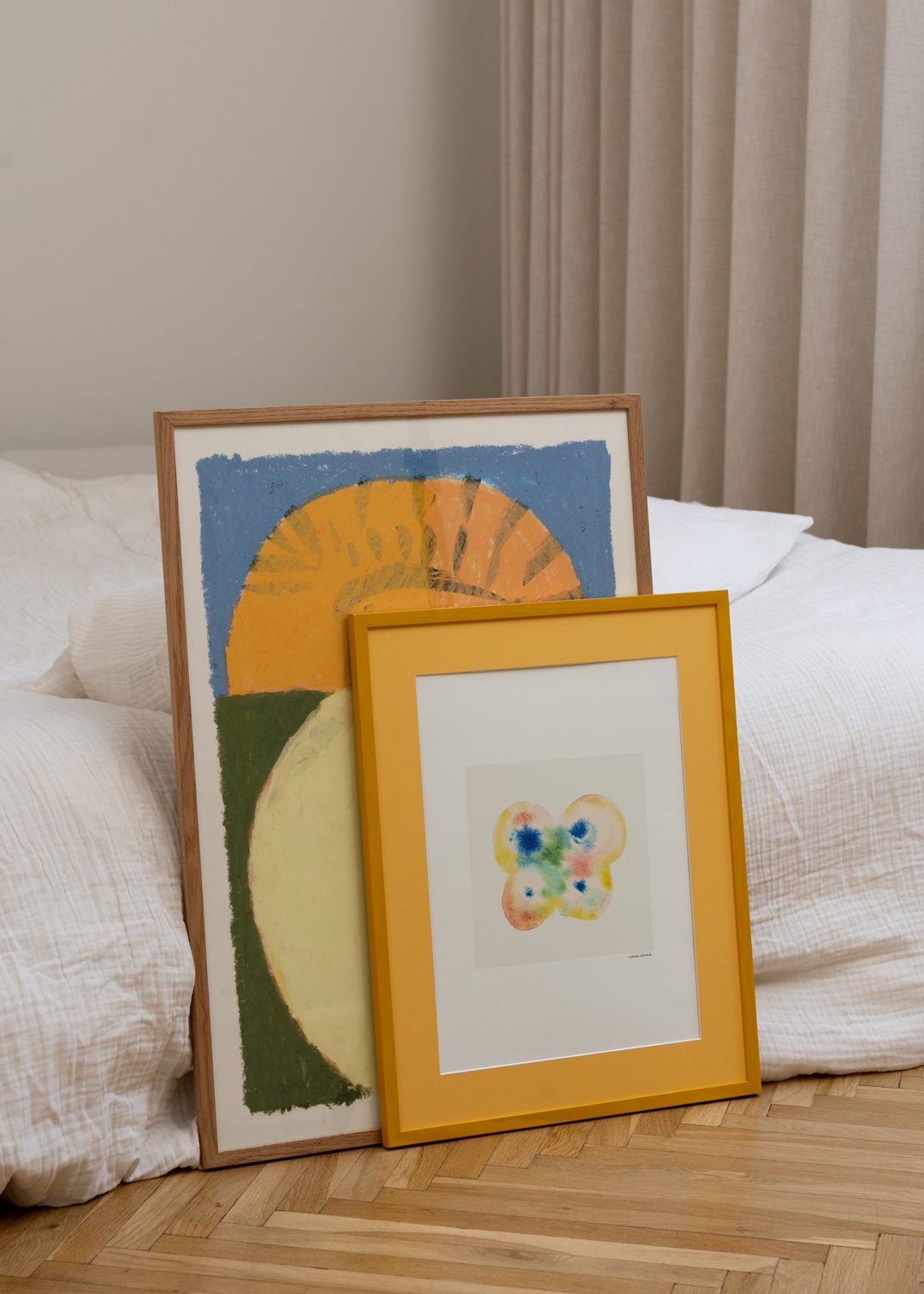 Soft, muted colours and an artistic look inspired by nature define this pairing. The Eye evokes the warmth of a sunrise over natural landscapes, while the delicate composition of Papillon No. 02 adds a playful, organic touch. Together, they bring a sense of calm and creativity, perfect for a bedroom or smaller wall space.